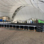 Podium 2×1 m modulable, montage sans outils, 750 kg/m², usage intérieur/extérieur. |